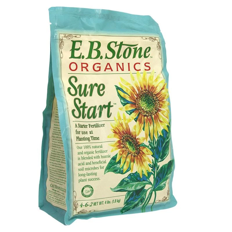 E. B. Stone Sure Start is a blend of natural organic ingredients formulated to help newly transplanted plants develop strong roots and sturdy growth. Sure Start is rich in natural sources of phosphate to help your plants develop a strong foundation for future growth. The gentle and non-burning formula is safe to use with even the most tender transplants.